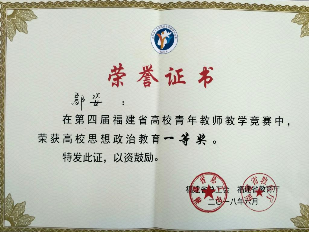 6月20日-23日,由福建省总工会、福建省教育厅主办,武夷学院承办,福建教育学院协办的福建省第四届高校青年教师教学竞赛在武夷学院举行。我校马克思主义学院鄢姿老师荣获思想政治学科一等奖,同时被授予“福建省高校青年教学名师”荣誉称号。
