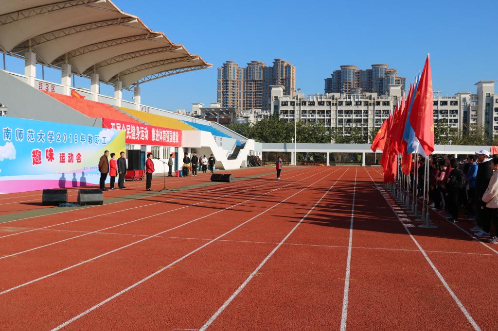 12月8日,我校2019年教职工趣味运动会在西区田径场胜利举行。校党委常委、副校长、工会主席蒋一婷出席开幕式并致辞。校工会常务副主席陈惠卿,副主席蔡如兴、武玉元、方琼,各代表队领队、运动员及全体裁判员参加了运动会开幕式。