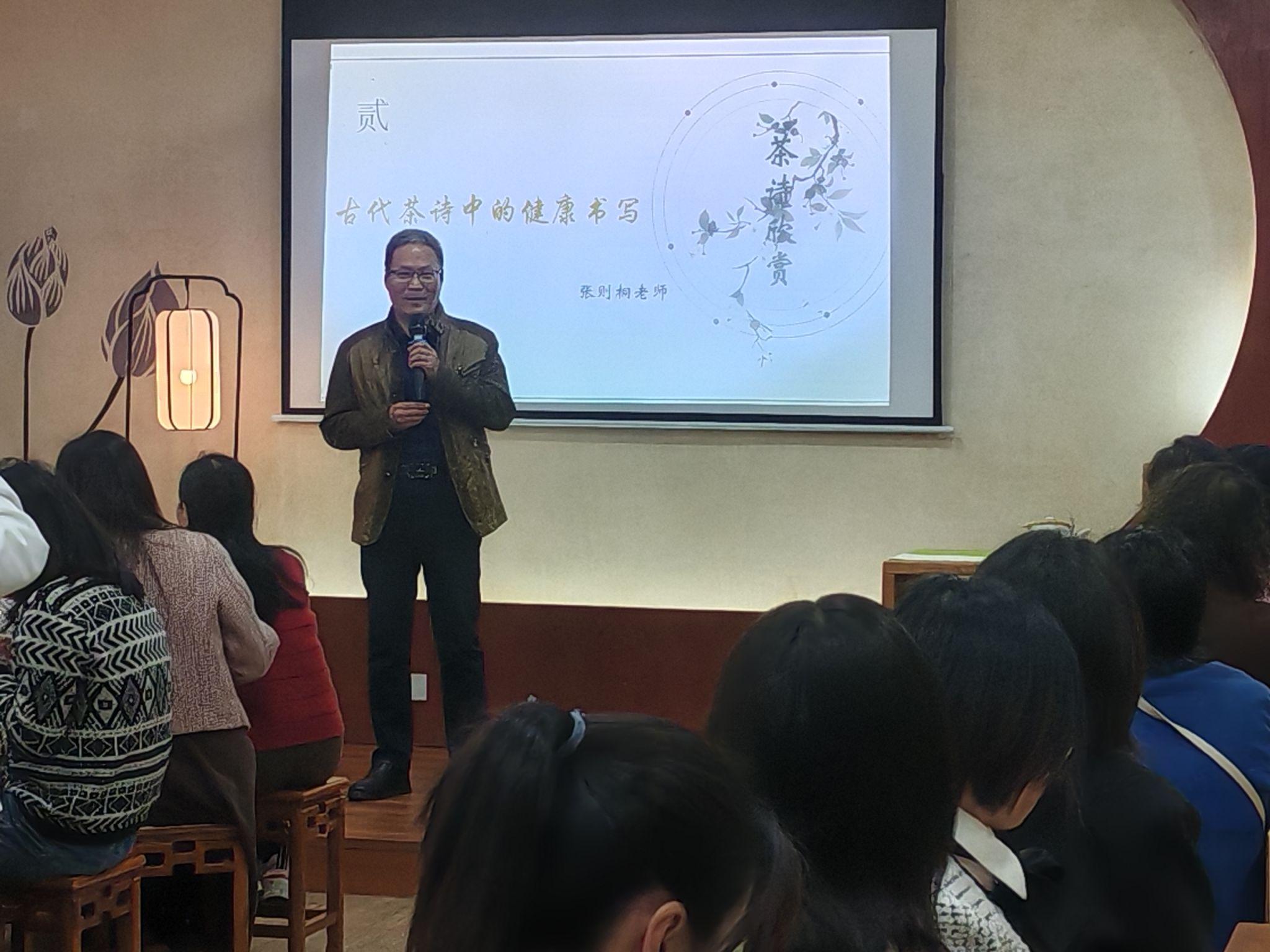 “品茗谈天地,赏花语人生。”在惊蛰茶诗欣赏环节,文学院张则桐教授以专业的视角和深厚的文学素养,深入解读了古代茶诗中关于健康的书写。在他的讲解下,师生们仿佛穿越时空,与古人对话,深刻品味茶诗的精妙之处以及茶与生活、自然之间千丝万缕的紧密联系。