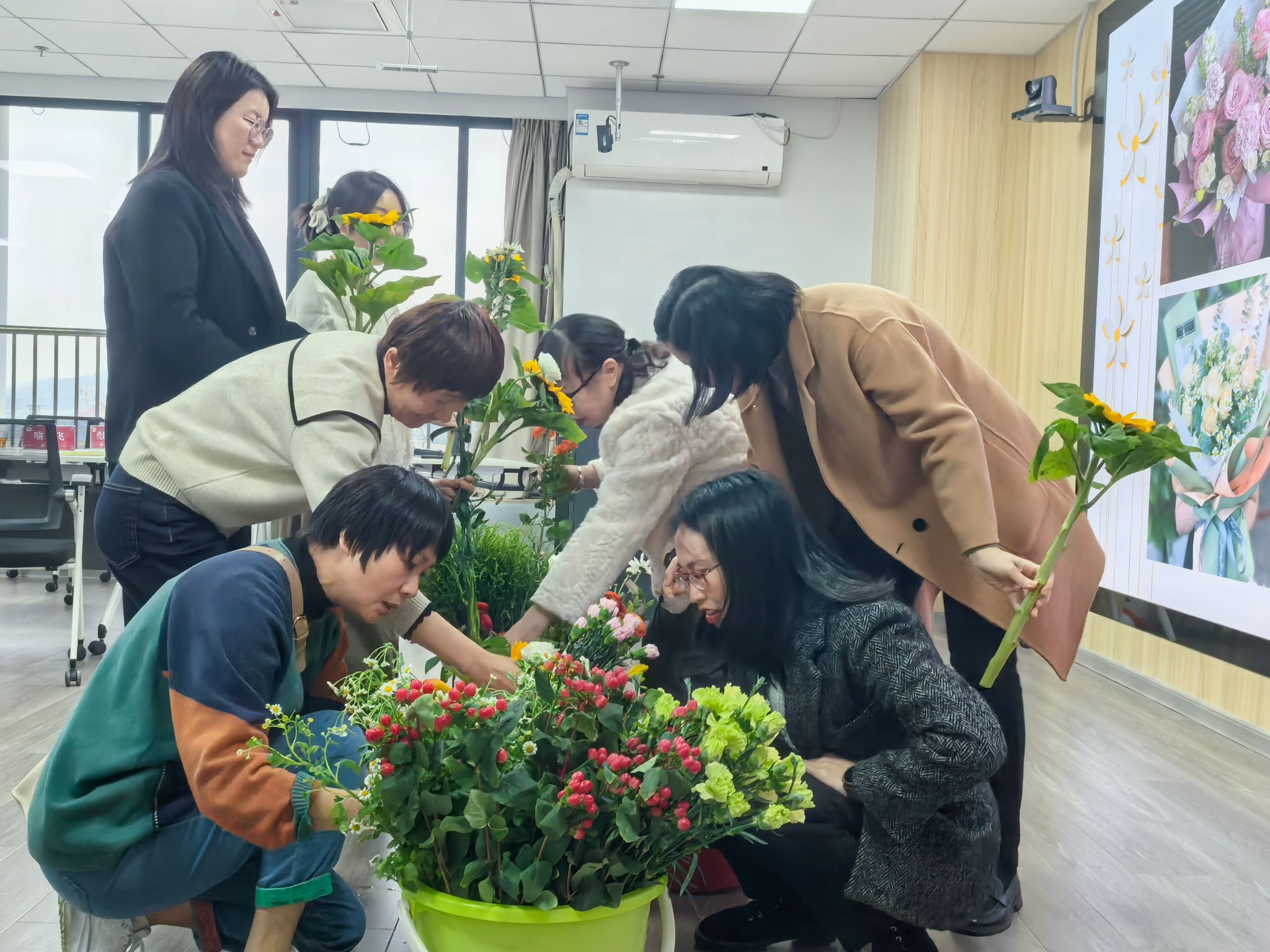 读书分享会后,学院同步举办“指尖生春·花漾时光”创意插花活动。从选花搭配、色彩层次到造型设计,女教职工们发挥巧思,将玫瑰、康乃馨、洋桔梗等花材精心修剪、错落组合,创作出独具匠心的插花作品。尽管没有专业花艺师指导,但活动现场芬芳满室,欢声笑语不断,大家在花香中放松身心,感受艺术与自然的融合之美。
