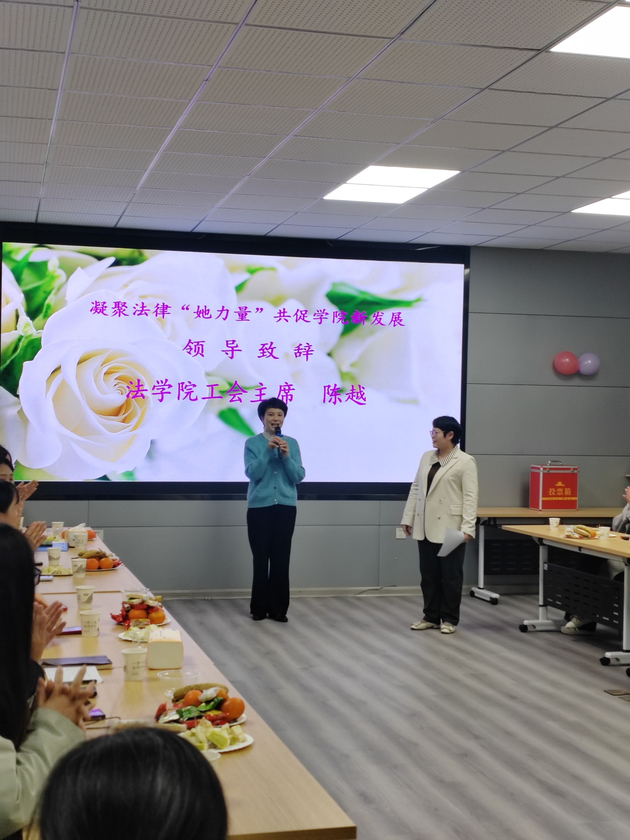 活动伊始,陈越代表法学院致辞,向学院全体女教职工致以节日问候。她高度赞扬了女教职工群体“以柔肩担重任,用匠心育英才”的卓越贡献,特别提到近几年学院建设新突破中,女教职工们发挥着非常关键的作用,向为人才培养倾注心血的巾帼园丁们,致以崇高的敬意和节日的祝福!